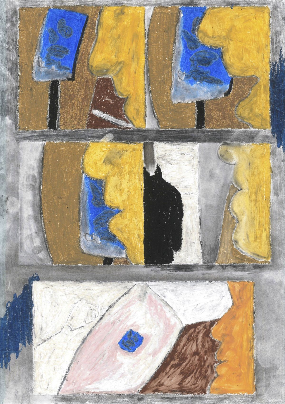 These stories of mine have become laden with themes of stagnation and punishment, and of estrangement and reconciliation – in which they sit in some feverish, blended realm of painting and ethnofiction. This purgatorial world - fixed between a dissonant East and impalpable West Ireland - is something of a lodgings for the contrasting gaudy and earthy colourations of acrylic paint; buttery swellings of wax residue; and leaden charcoal whiffs and trails, that atone for my own muddled identity as a scantily clad Irishman.