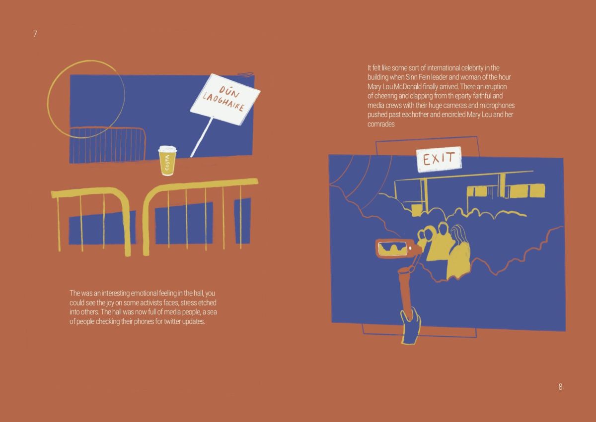 ‘Scenes From The Count’ is an illustrative memento of the day I spent at the Dublin Count Center for the 2020 Election, giving a personal account of the events of the day. This contrasts against the more pure information based content of the other two outcomes.