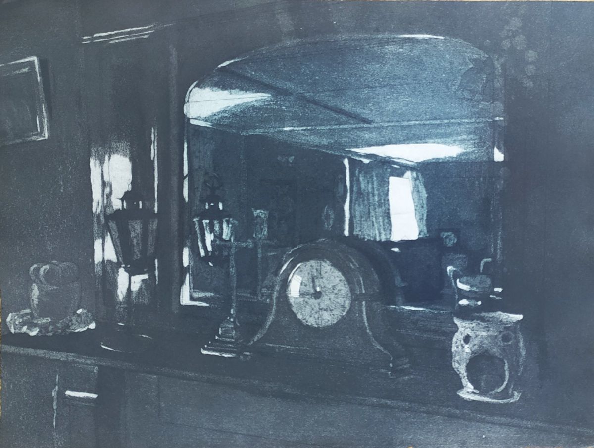 Materials: Aquatint, hard ground etching, collage, photography, photo manipulation, moving image, dry point and mono-printing.